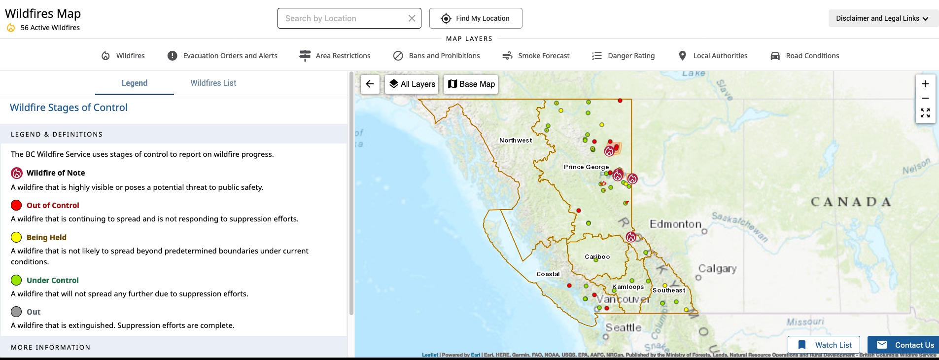 A snapshot of the BC Wildfire Service interactive Wildfires Map (screenshot is from May 15th, 2023)