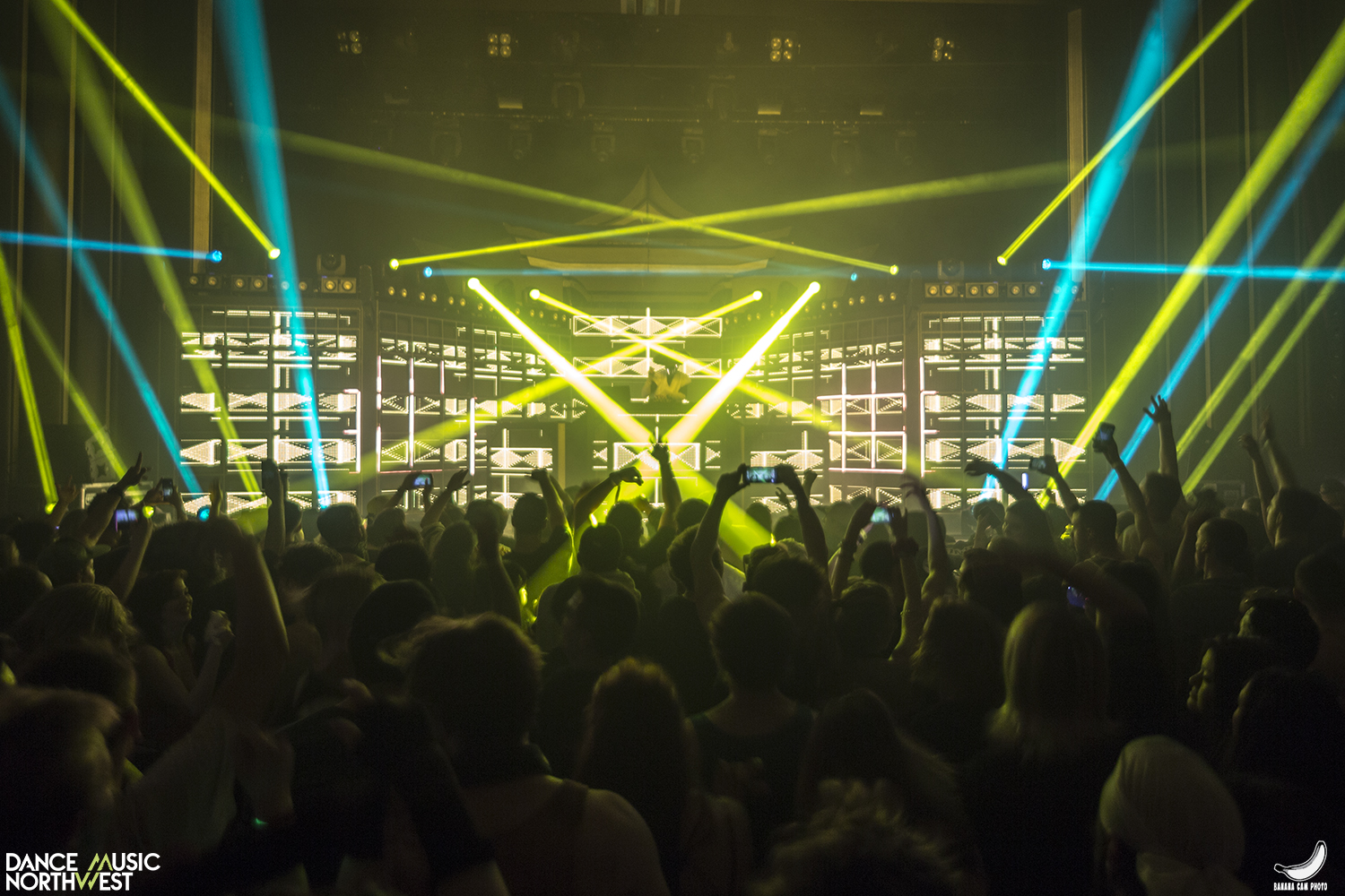 We arrived slightly before doors opened and could literally feel the bass from sound check. The outside glass was shaking and we chuckled as we saw several staff members rushing for ear plugs. The night kicked of with B.C. local act Kytami who were recently added as support for the last few stops of the tour. We’d seen them earlier this month and it was a pleasure to once again see their blend of violin and bass music. With Virtual Riot and Crizzly to follow, we increasingly felt both the excitement for the stage unveiling, and rising bass level. After a brief intermission which featured both The Backstreet Boys – I Want it That Way and the Banana Phone Song it was time to kick this show to 11.
