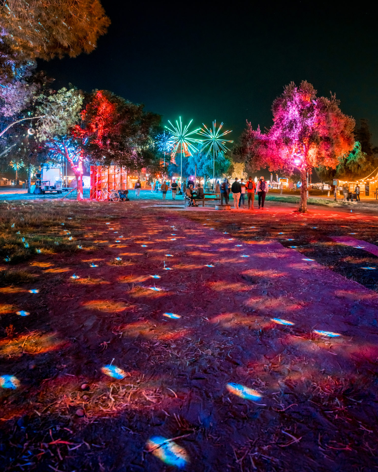 We wandered throughout the grounds, checking out everything the welcoming night had to offer. There were all sorts of art installations and funky little stages that mesmerized us at first sight. We laid back in some of the kooky-styled sitting areas to take it all in.