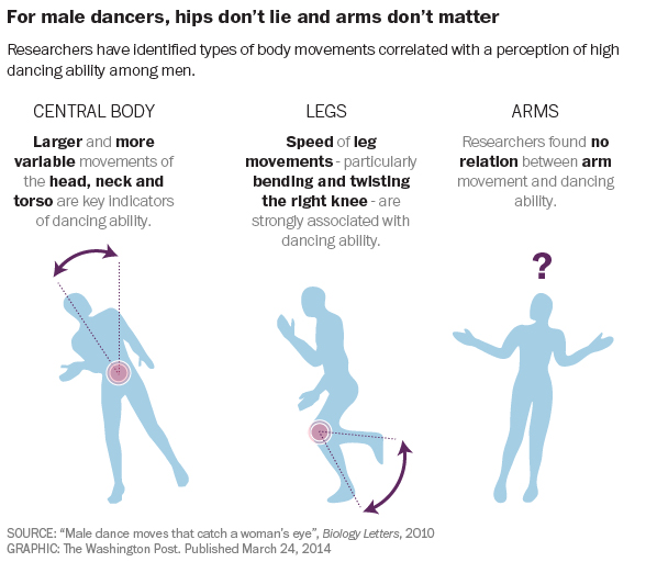 “Male movements serve as courtship signals in many animal species, and may honestly reflect the genotypic and/or phenotypic quality of the individual. Attractive human dance moves, particularly those of males, have been reported to show associations with measures of physical strength, prenatal androgenization and symmetry.”