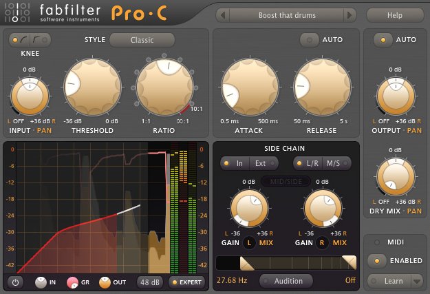 Many of the plugins here attempt to bring vintage classics into the modern age. The Pro-C is firmly planted in the future. First, the sidechain is incredibly flexible. With high and low pass filters, volume and mix controls for L & R, and even support for M/S compression, you can sidechain any way you want. There’s also MIDI Learn functionality and what FabFilter calls Smart Parameter Interpolation. Essentially, automation sounds smooth and natural.