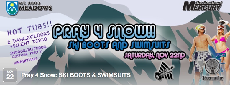 If you can’t wait until February, and are looking for something local with a similar ski and snowboard flair, you might want to check out the first annual Mt. Hood Meadows and Portland Mercury Pray 4 Snow: Ski Boots & Swimsuits party at Popina Swimwear in NE Portland this Saturday, November 22nd.