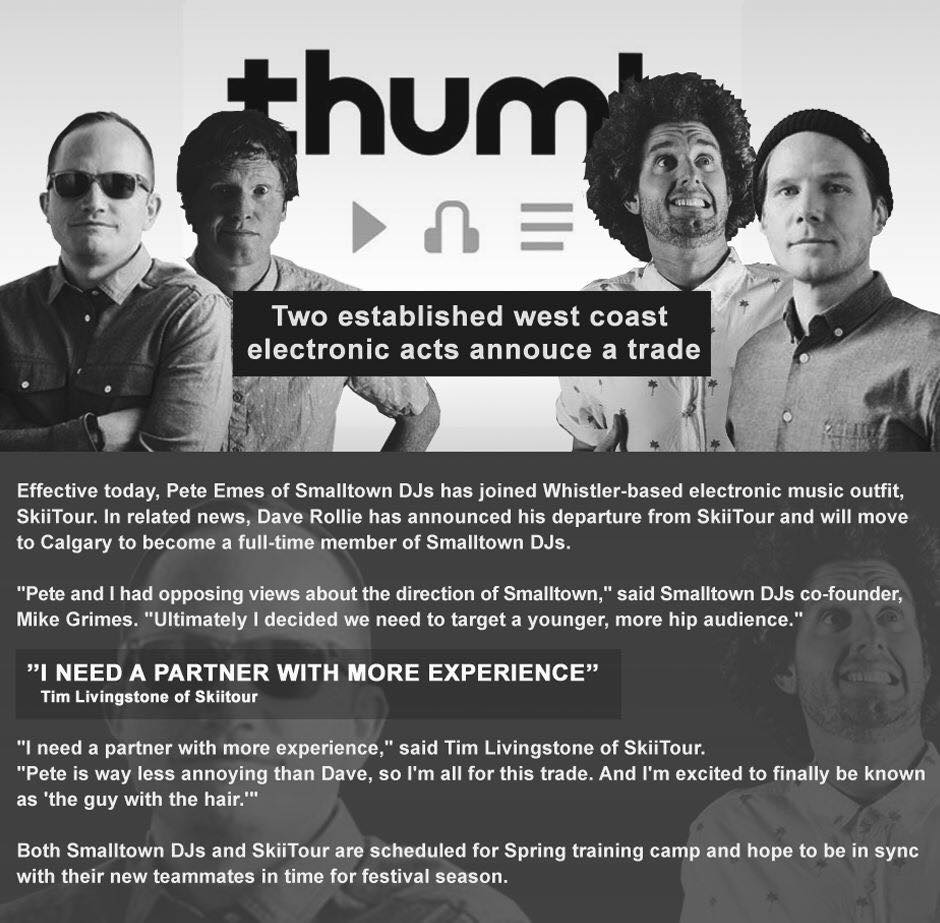 We love Skiitour and we love Smalltown DJ’s. This one just had us outright laughing hystarically when we first saw this on Skiitour’s Tim Livingstone’s Facebook page. Sitting “opposing views” and a move to “target a younger, more hip audience”, this trade could’ve possibly opened the doors for the makings of some interesting tracks. We think the most important question to ask though is: who ends up being “SmallTour” and “SkiiTown DJs”?