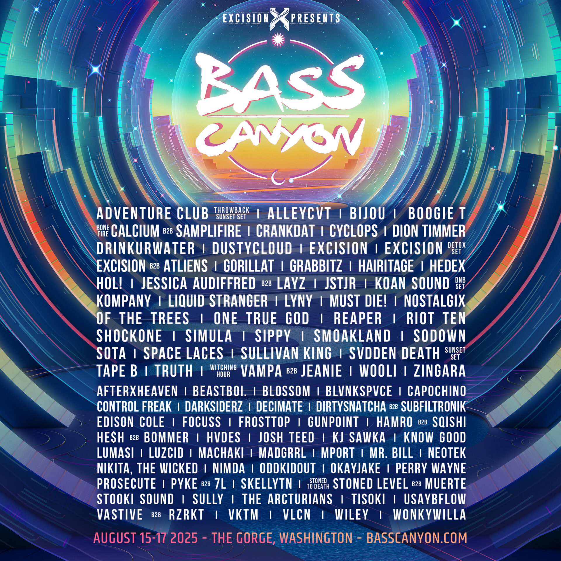 The wait is over! The full lineup for the seventh annual Bass Canyon has been announced. After revealing an incredibly stacked Phase One lineup back in April, Excision Presents comes back even stronger with 13 new additional acts, an insane list of B2B sets, and more. Set to return to the Gorge Amphitheatre in Quincy, WA from August 15-17, 2025, the festival boasts 90+ acts and mind-boggling production at one of the most beautiful outdoor venues in the country.