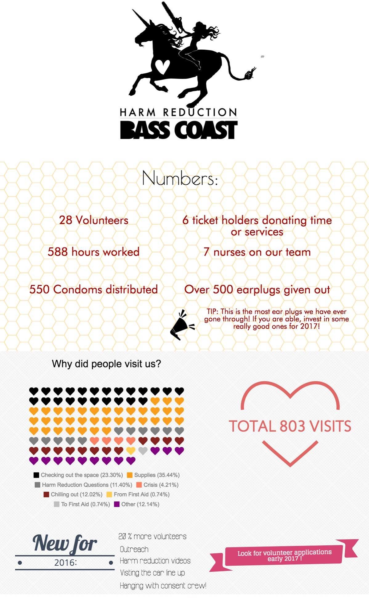 The setup at Bass Coast is actually pretty simple and includes their staff of nurses and volunteers who receive ample preparation. The volunteers are trained in harm reduction for the 8 weeks leading up to the festival, so that they arrive prepared. The Sanctuary space (the home base for harm reduction) is open 24 hours a day as soon as gates open. The two things they provide in their Sanctuary space are supplies and information about a whole range of health topics. As well as a hang out spot for people who are feeling overwhelmed or needing to ground themselves. Volunteers also do outreach to the stages and camps and festival grounds, letting people know that they are there to provide any assistance with questions, supplies, or help
