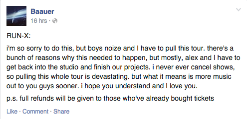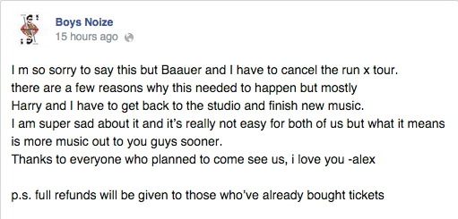 Baauer and Boys Noize were scheduled for a busy fall traveling across the United States and Canada to deliver glorious trap. However, they have just announced the cancellation of nearly all of their upcoming shows. The announcement was made via social media and subsequent updates to the tour can be seen on Boys Noize’s website.