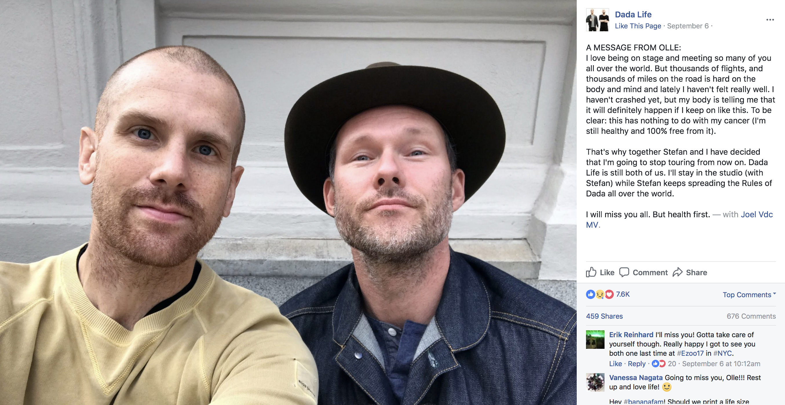 There’s been nothing but good vibes sent towards Olle from Dada Life after his touring break announcement. On a Facebook post, Olle touched on the physical stress of performing show after show. Back in 2014, the duo became a one-man show for a while due to Olle’s cancer scare. Health comes first. Though Olle mentioned his break from touring has nothing to do with his cancer scare, he is still in need of a long rest.