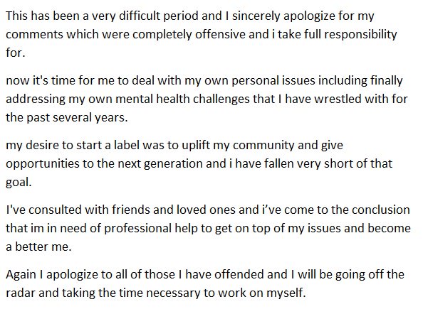 In addition to his apologies, the producer shares that his goal has always been to uplift his community, and that he’s fallen short of that. In conclusion he commits to removing himself from the spotlight and spend time working on himself.