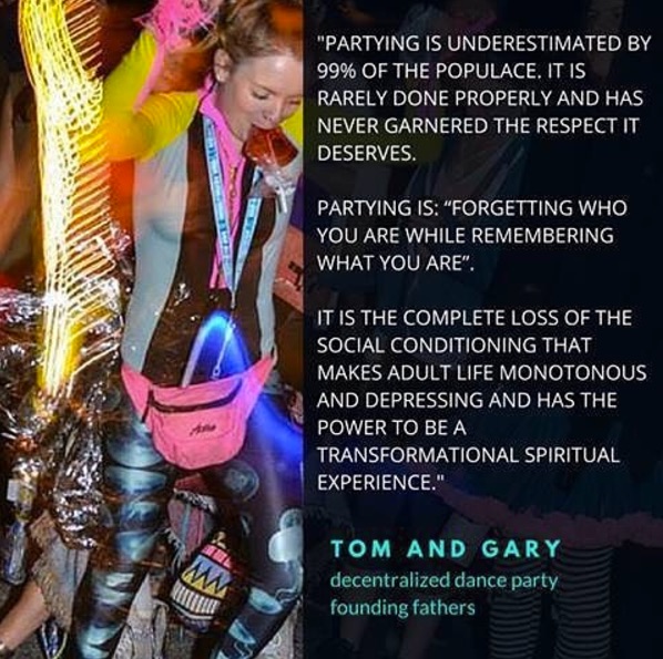 “People drink a lot at most Parties because most Parties are boring and drinking is therefore necessary to loosen up and have fun. This is due to poor music, dull clothing, lack of props and lame atmosphere; all of which inhibit singing and dancing and living free. But if the Party is really good, the atmosphere alone will inspire people to lose their inhibitions and freak out and drive the energy to ridiculous heights and make it an incredible experience for everyone. Creating a Party like that is very hard to do, but it should be the goal every time.” – The DDP Party Manifesto