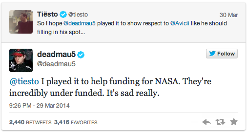 After Tiesto’s rant on Twitter the social media world almost burst into a war once again over Joel being Joel. Look at it this way, Ultra Music Festival had to find someone “bigger” to replace Avicii’s close out set on Saturday night (Deadmau5 did this back in 2011… it was awesome) so they probably called Joel and begged him (including an obscene amount of money in the process) to fill in. Let’s not forget the rant Joel went on a few years ago slamming the Miami festival and ‘EDM’, most of which has ended up turning out to be pretty true (EDM turning more commercial and UMF suckering their fan base for more money on this years ticket sales – $500 GA early bird). Deadmau5 clearly put on a show for those attendees who paid for over priced festival tickets.