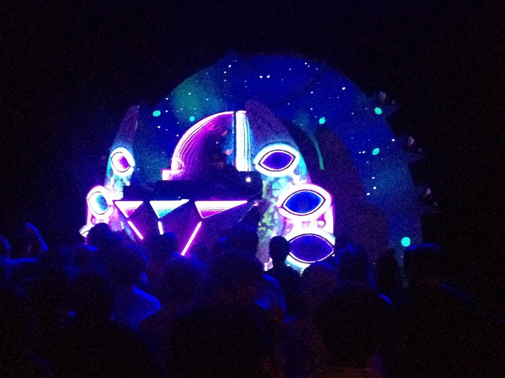 The opener for Shpongle was Phutureprimitive, and we were blown away by the delicious dirty bass that made up his set. What was also unique about Phutureprimitive, aka Rain, was the way he made his music, which he describes as “dripping wet love drops of nasty mind melting sonic bliss”. In addition to the typical DJ equipment one would expect he had this orb with multiple glowing panels that made different sounds depending on what parts he touched. It was mind blowing, but not as mind blowing as what would end his set. Rain got on the mic for a few moments and spoke a Maya Angelou quote, reminding us to bring love back to wherever we were going. He had no idea that we were going back to Seattle the next day, but the words spoke truth to our hearts and we were very grateful for the timing. Fortunately we also got to meet him after the set and tell him this in person.