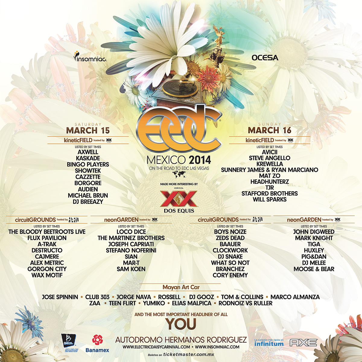 Today the first ever EDC Mexico announced phase 2 artists and released single day ticketing information. Joining artists are A-Trak, Axwell, Cazzette, DJ Breeazy, DJ Melee and Kaskade. The festival will take place in Mexico City at Autodromo Hermano Rodriguez racetrack on March 15th & 16th.