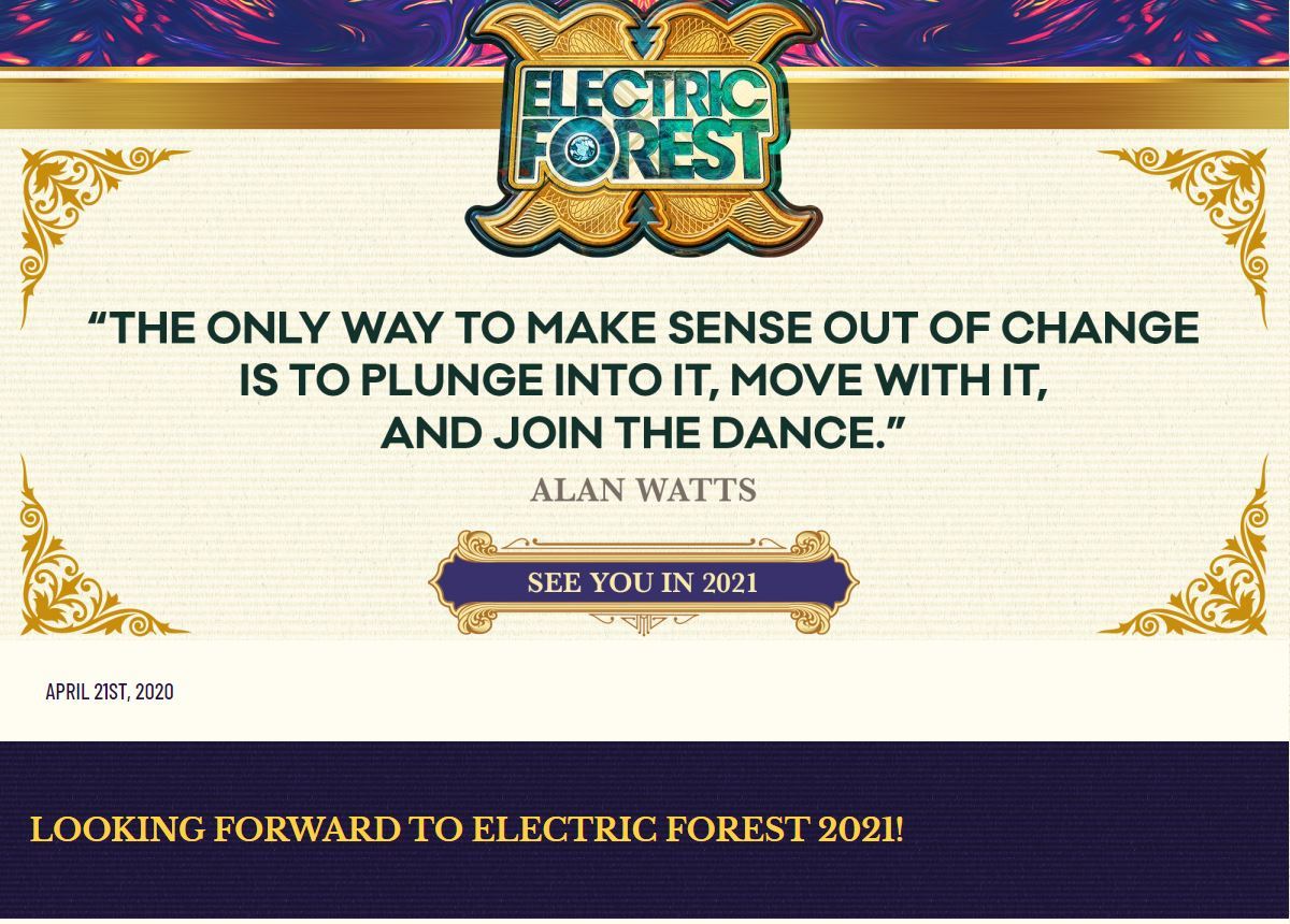 This announcement comes as cancellations continue to creep further and further into that summer festival season. With Electric Forest clearly not happening, the possibility of progression for cancelled events appears to be pushed out all the way to July.