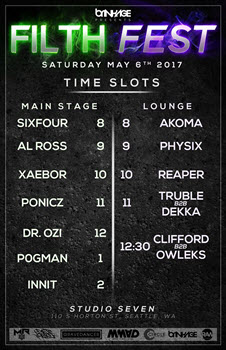 This is the second year Filthfest is being held in Seattle after moving last year’s Filthfest 6 down from Bellingham, WA. This years lineup features big names such as Dr. Ozi, P0gman and Ponicz to name a few and will receive support from local favorites such as Sixfour and INNIT.