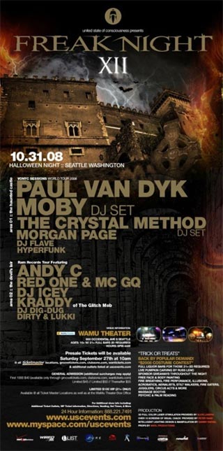 We’re kicking off our series with one of the best lineups in FreakNight history: FreakNight XII in 2008. Taking place at the WaMu Theater on Halloween night, the two-stage, one-night event featured Paul Van Dyk, Moby, Andy C, The Crystal Method, and more.