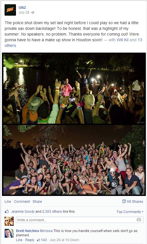 Just a few days ago, when performing at Mystic Festival in Houston, TX, Griz had his set shut down by the police before he was able to perform. It would be really disappointing to have something end your set early; take a look at Mimosa’s recent reaction to having his equipment unplugged. It would be even more frustrating to have the show shut down before getting started. Griz is a real gentleman though, and performed an acoustic set on the saxophone backstage for fans. Instead of getting upset at festival organizers, he called the event the highlight of his summer.