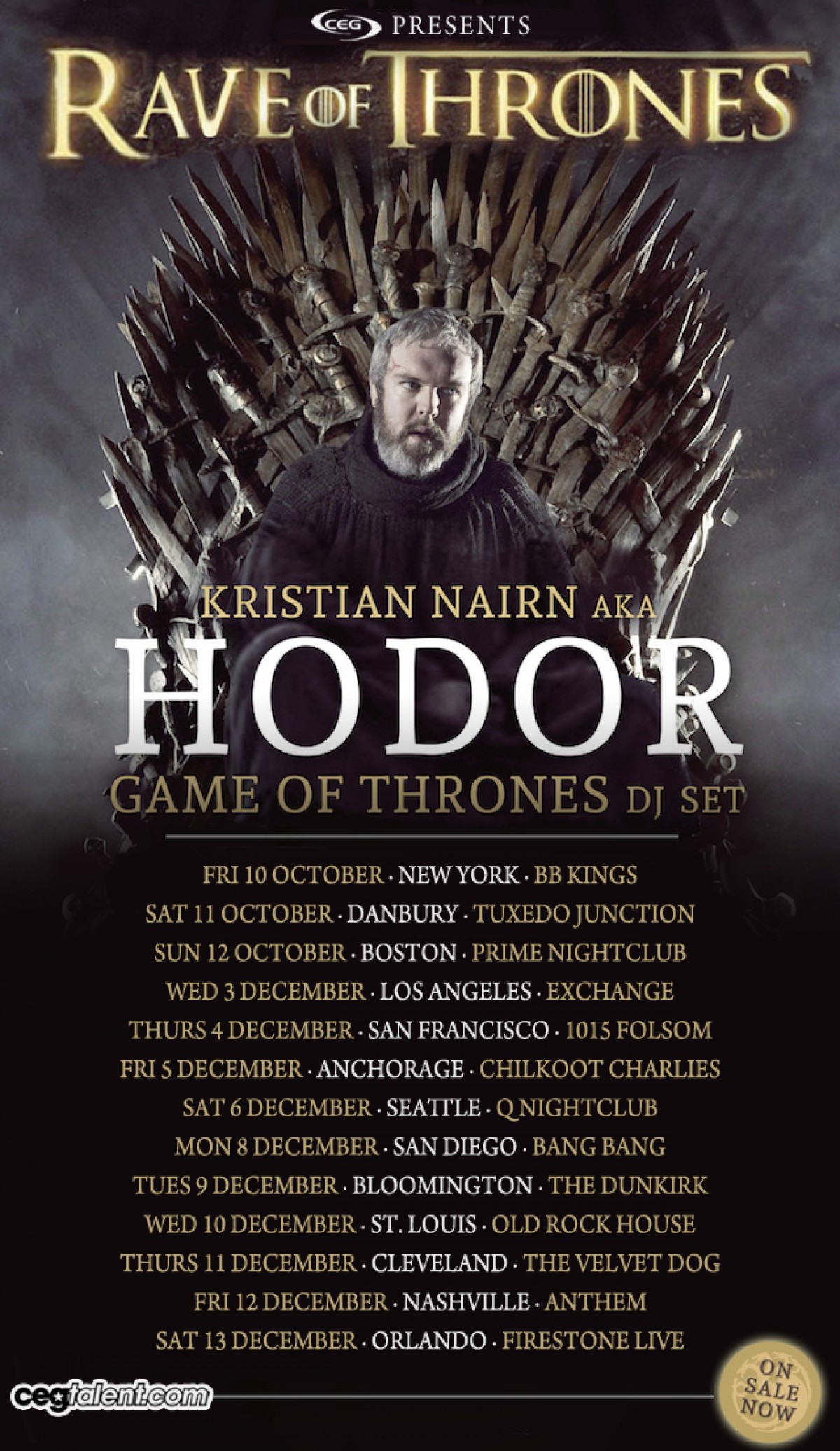 Game of Thrones actor Kristian Nairn reveals the other side of Hodor on his DJ tour.  We can only hope the Rave of Thrones tour features everything from fire breathing dragons to White Walkers.