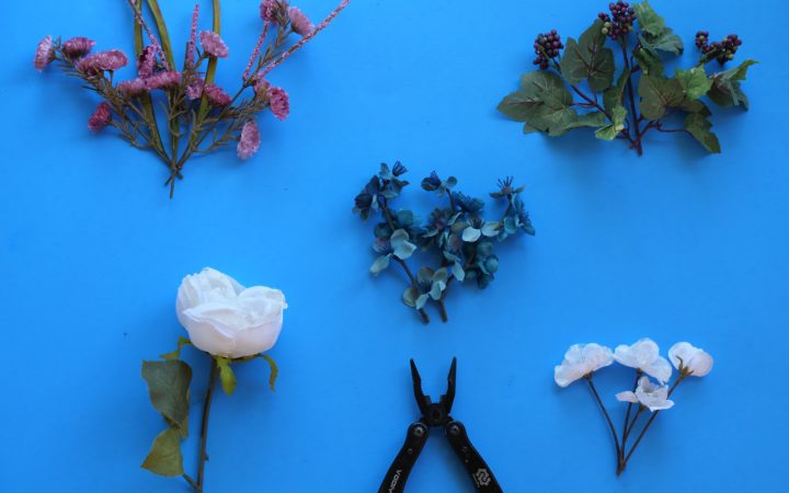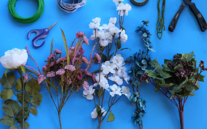 Once you have all your materials, cut each of your flowers and greenery pieces to about 3-4 inches long. We normally work with fake flowers, so wire cutters are the easiest to use. If you use real flowers, kitchen scissors should work fine.