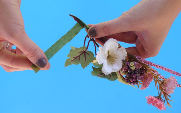 Now to make mini bouquets! We have done flower crowns before by adding one flower at a time, but by the time we were done there was too much unnecessary tape. We found out that if you make mini bouquets, you have less wire and tape.