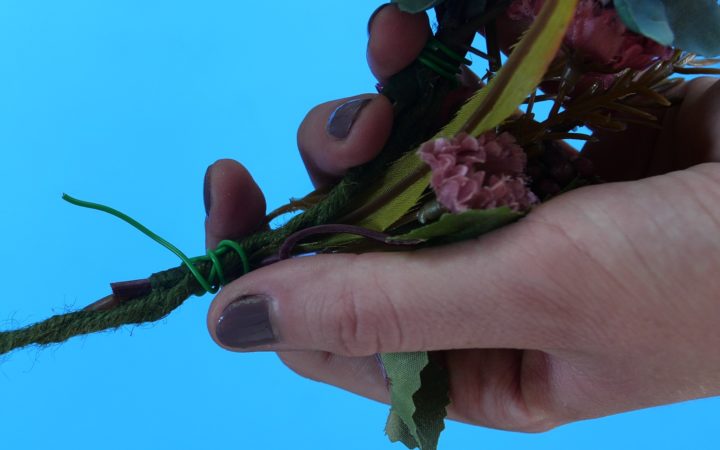 Eden suggests some space between your bunches. Don’t get to tight to the last bunch. “You want them to overlap but not sit right on top of it either.” Wrap wire around the end of the mini bouquets to attach them to the base. Use only enough wire to make them sturdy. You can also use tape, but wire will be stronger.