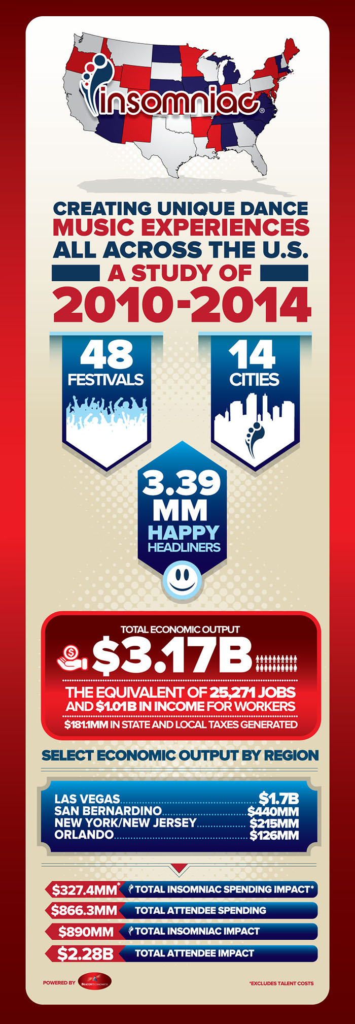 In a recent survey conducted by Beacon Economics, we’re told Insomniac Events has generated over $3 billion for the U.S. Economy. The report looked at 48 Insomniac festivals across the U.S., including Electric Daisy Carnival, Escape All Hollows Eve, Nocturnal Wonderland, and many more between 2010 and 2014. This report comes off the heels of another sold out EDC Las Vegas and the recent sellout of Dream State.