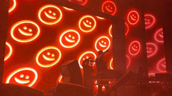 Shot of Darren Styles performing in Vancouver BC indoors with red lights and red smiley face visuals. Shot of Darren Styles performing in Vancouver BC indoors with red lights and red smiley face visuals.