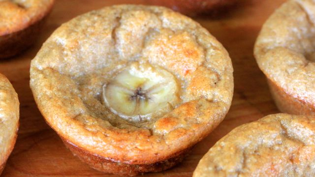 Pre-heat oven to 350 degrees. Spray 12-tin muffin tray with cooking spray. Pop all the ingredients into a blender and blend until smooth. Divide mixture evenly among 12 muffin tins. Place a thin slice of banana on top of each muffin. Bake for twenty minutes or until cooked through. Enjoy!