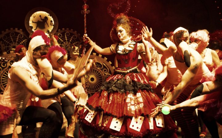 Interspersed throughout the evening were a variety of performances so grand even the Queen would be impressed. Oregon Country Fair’s performance troupe, Risk of Change, gallivanted through the crowd taking the persona of flamingos and the royal highness herself, playing the most magnificent game of croquet. On stage we were captivated by the variety of Wanderlust Circus. Their routine ranged from feats of incredible strength to dastardly aerial acrobatics to some truly imaginative work with a hover board. And as Antennae took the stage, so did all of the Alice’s from the crowd – both men and women.
