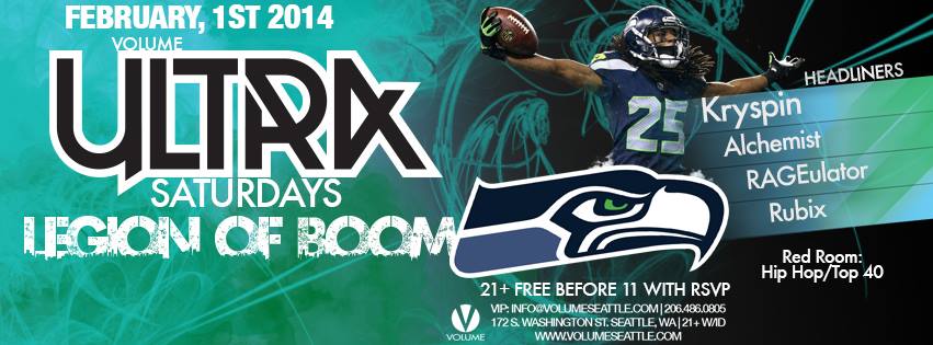 We’re celebrating Super Bowl weekend at Volume with a completely Seahawks themed edition of ULTRA Saturdays. We’ll be running specials on Seahawks themed drinks all night. Wear your Seahawks gear and bring the LEGION OF BOOM to Volume!