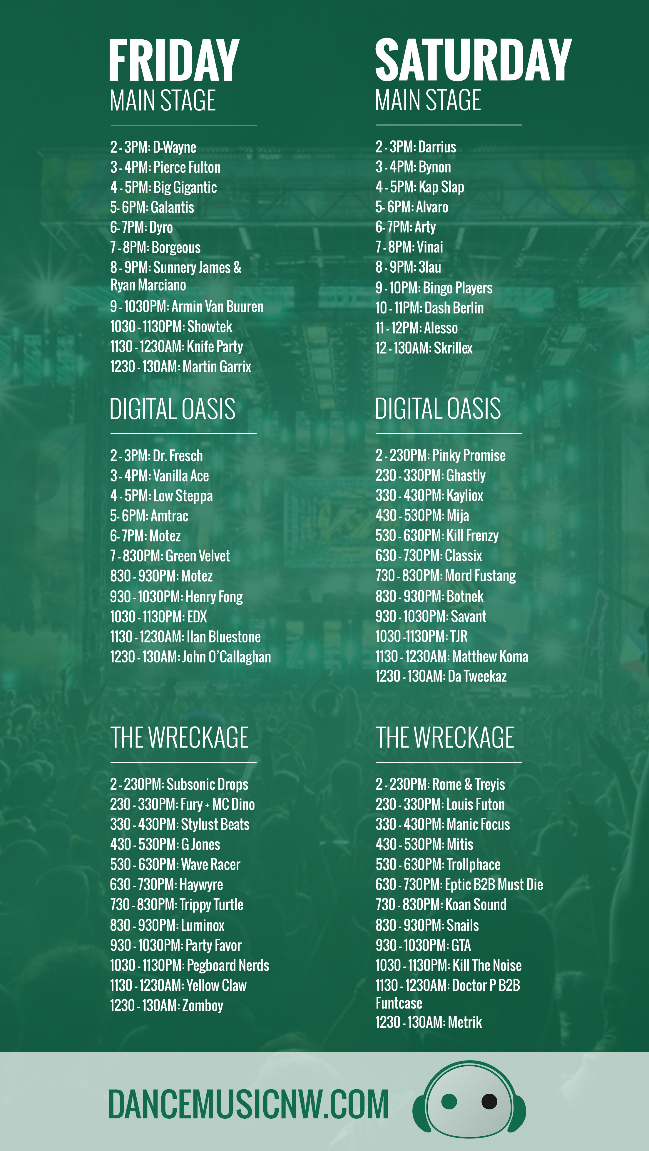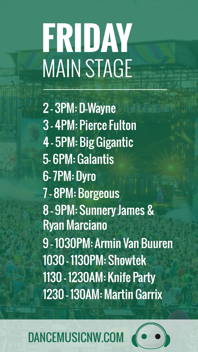 In what’s become a yearly tradition here at DMNW, we’re happy to present you, the fans, with our handy smartphone schedules! This year though, we decided to do something a little special. In addition to the full breakdown of every set time for both days, we’ve also included individual backgrounds for each stage on each day. Think you’ll be camping out at the bass stage for Saturday’s b2b extravaganza? Will you be sitting front and center at the mainstage the day Armin takes us on a sunset journey? We have a smartphone background for all of that!