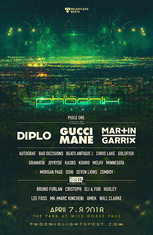 Relentless Beats has announced the full phase 1 lineup for this year’s Phoenix Lights Festival. Phase 1 included headliners Diplo, Gucci Mane and Martin Garrix. The festival will be held on April 7-8 of 2018. This year, the show will take place at Wild Horse Pass (Gold Rush was held in the same area) with custom built surroundings for the event.