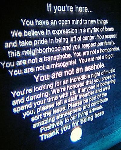 Even more though, it’s about creating an environment where the raised standards of art and performance inspire us to either raise our own behavioral standards, or not attend at all. Anyone who can’t respect their fellow clubgoer is given one warning, and then asked to leave if they’re unable to comply. In the end, the goal becomes to “create a space of openness and tolerance,” rather than one where women don’t feel safe in a crowd alone, a feeling that’s become frighteningly common in our local scene. Changing that paradigm begins with raising our expectations for how people should behave.