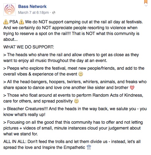 However with everything to take in at some shows we do strongly feel you have a much more immersive experience somewhere in the middle. Shows have become about much more than just the music with a heavy focus on stage producing. We feel riding rail certainly has its merits, but limits your ability to be fully involved with the show. The wonderful thing about our community is how diverse we are, and how accepting of each other we’ve grown to be. Any show you go to will guarantee you the opportunity to run in to all forms of concert goers, and thats a great quality to have. Recently this topic was brought up after a show in South Florida featuring Bassnectar which lead to a little disagreement between fans. We felt it would be appropriate to end on that post, as we strongly agree with everything The Bass Network has to say.