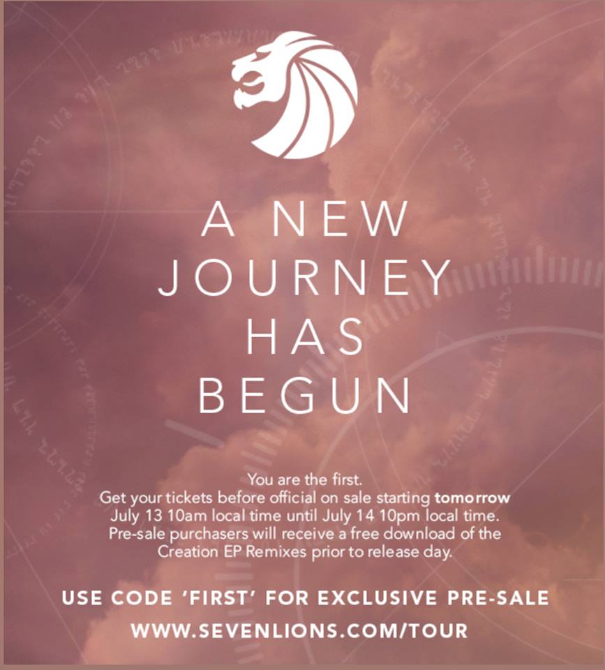 Subscribers to the Seven Lions email newsletter were informed that there will be a ticket presale tomorrow July 13th at 10am. Presale purchases include a free download of the Creation EP Remixes album prior to the release date. The entry code for the presale is FIRST.