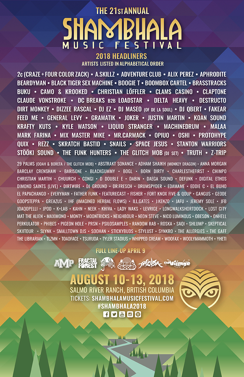 Shambhala is back with their 2018 lineup! This year’s artist roster melds old school, with names like Aphrodite, Dizzee Rascal, DJ Maseo (Of De La Soul fame!) and Joker, with the best in established current talent, including masked virtuosos Black Tiger Sex Machine, Dirtybird pioneer Claude Von Stroke, and Destructo.
