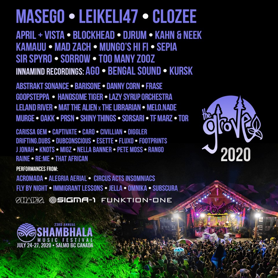 Full of Shambhala-favorites, The Grove features a bevy of beautiful artists performing at The Farm this year. Headlined by the return of CloZee, the Shambhala-debut of Leikeli47, and the unique blend of music that is Masego, The Grove is sure to become the favorite stage of many new attendees. Showcasing everything from hip-hop and trap to dubstep and techno, The Grove is the perfect place to find yourself while roaming The Farm. And adding acts like Too Many Zooz, Lazy Syrup Orchestra, and Shiny Things to a lineup that already features a takeover from Innamind Recordings and a Mat The Alien x The Librarian set, is too much to keep us away from The Grove for long.