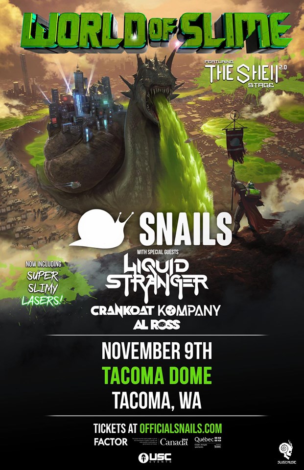 Vomit squad fans, it’s time to rejoice because Snails is bringing his World of Slime tour to the Tacoma Dome on November 9th. Boasting a new slugz edition of super slimy lasers as well as his Shell 2.0 holographic stage. Special guests are promised, and Snails didn’t disappoint as Liquid Stranger was also added to this stop’s lineup. The full lineup includes Rusko, Kompany as well as touring support from Al Ross, Hi I’m Ghost, and Jayceeoh.