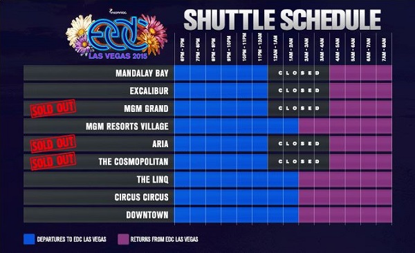 Arguably, the most reliable and cost-effective method to get to the Speedway are the official EDC Shuttles, priced at around $100 for a weekend pass. The pick-up locations include eight stops along the Strip, plus one stop Downtown. Designated pick-up locations for Aria, MGM Grand, and The Cosmopolitan have already sold out, so we suggest purchasing shuttle passes as soon as possible if you haven’t already. Also, take into consideration when choosing your pick-up location that a less-popular stop will mean fewer shuttle services, resulting in a longer wait time.