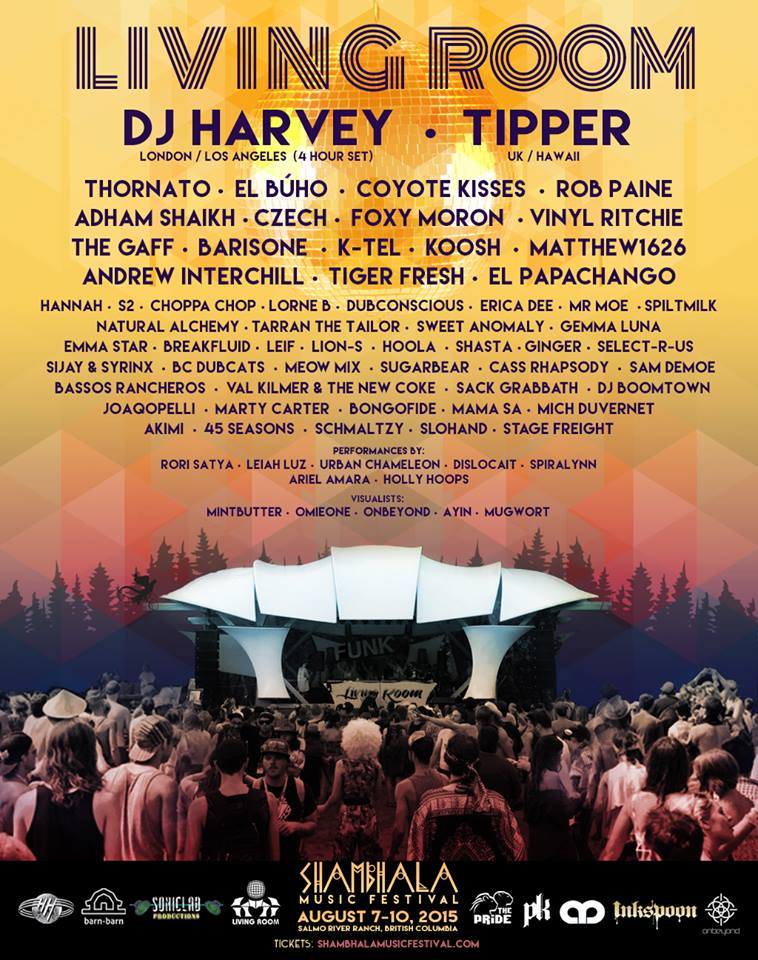 Every comfy home as a ‘Living Room’, and Shambhala is no different. Different every year, The Living Room stage is the only non-permanent stage at Shambhala, due to the changing landscape of the Salmo River each spring. Rearragned yearly, the ‘chill’ stage of the festival will be just that again in 2015. Featuring a 4-hour set from DJ Harvey, one of Tipper’s two sets, and many more artists we can’t wait see at Shambhala 2015.