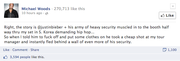 Justin Bieber gets on stage during one of Michael Wood’s sets in Asia, demands “mainstream” music, and then hits Woods’ manager in the face and runs away. Bieber, you’re a bitch.