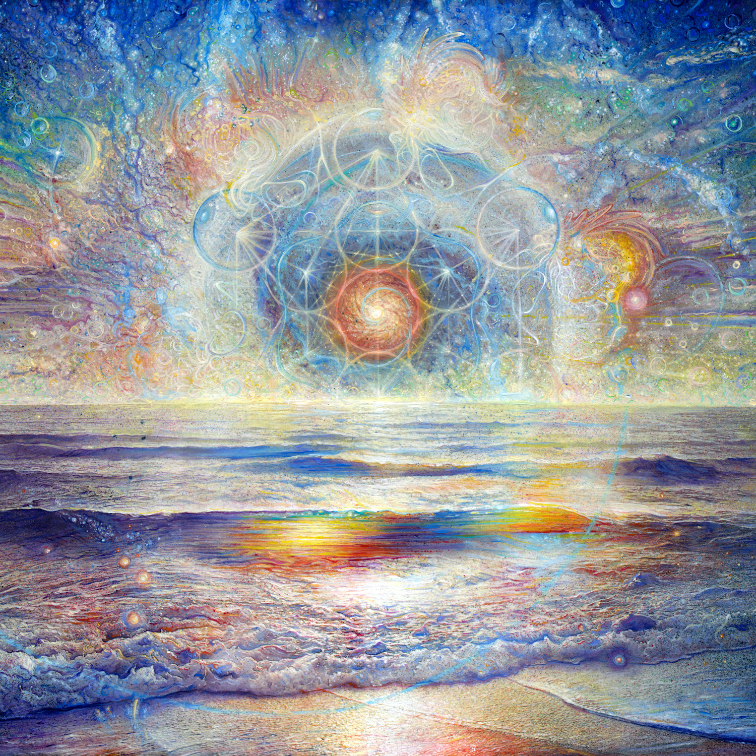 [divider]Alex Grey[/divider]Almost certainly the best known of the lot, Alex Grey has been featured all over the world on a variety of platforms. He will be best known some for his role in helping to create an aesthetic for the rock band, Tool, using various pieces. His works, mostly paints, range from intricate details of the self, in its various spiritual and physical forms, to conceptualizations of higher principles and beings.
