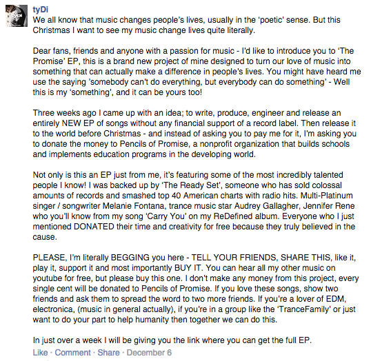 The Promise was produced without any financial help from any label, and tyDi won’t be making the money back from its sales. This EP is specially named this way because he’s made a commendable promise to donate all the sales proceeds to Pencils of Promise, in an effort to change the lives of children in the developing world through the construction of schools and the gift of a priceless education. He’s set a goal of $10,000 and you can donate through Pencil of Promise’s site or purchase via iTunes. You can help tyDi fulfill his promise at the links provided, as well as read up on his full message, via Facebook, below.