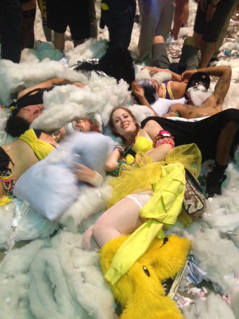 The pillow fight we had been hoping for happened as Stefan jumped to the front of the stage and assisted in distributing dozens of big, plump, fluffy pillows. He instructed the citizens to hold on to the pillows until the appointed time, then as the initial notes of Happy Violence began, pillows flew and stuffing came out, and next thing we knew fluff was floating in the air as dozens of joyous citizens gleefully pummeled each other with pillows.