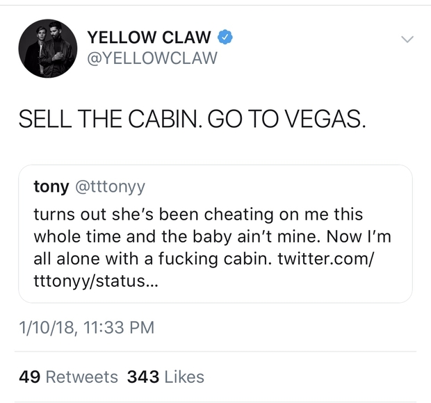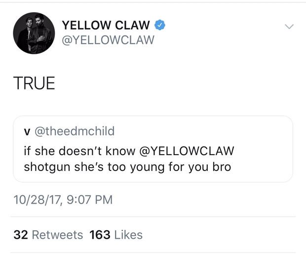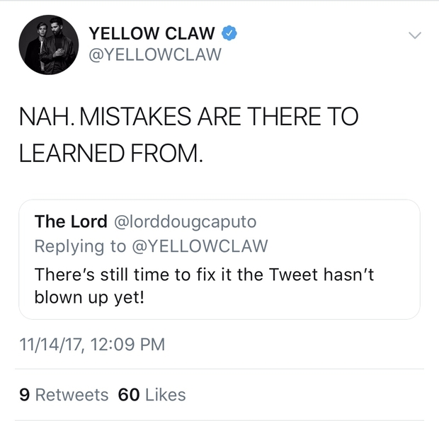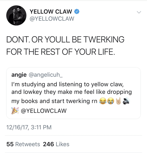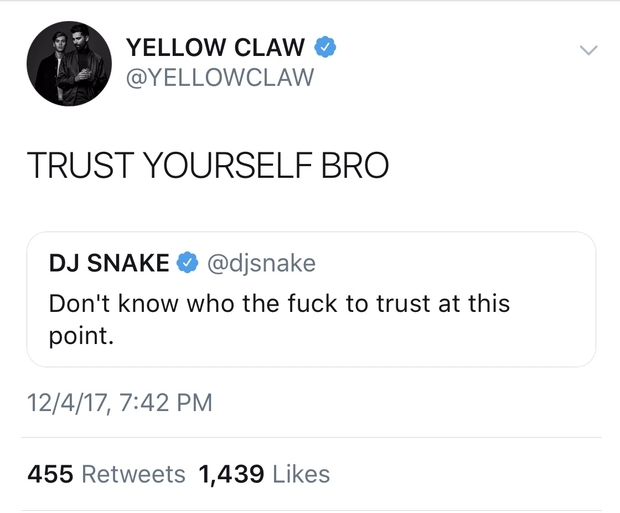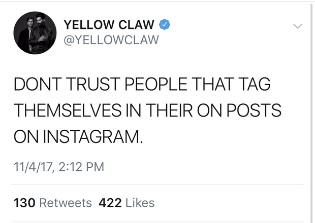 In a world dominated by social media, Yellow Claw has taken to Twitter to offer words of wisdom for fans, and fellow electronic dance artists alike. Writing in all caps, the duo of Jim and Nils even provide hot takes on Donald Trump, fashion, Vin Diesel, and others. Here are some of our favorite YC words of wisdom: