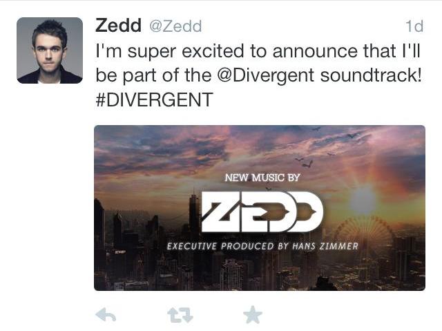Zedd tweets to his followers that he will be contributing to the soundtrack for the upcoming action film 'Divergent'.